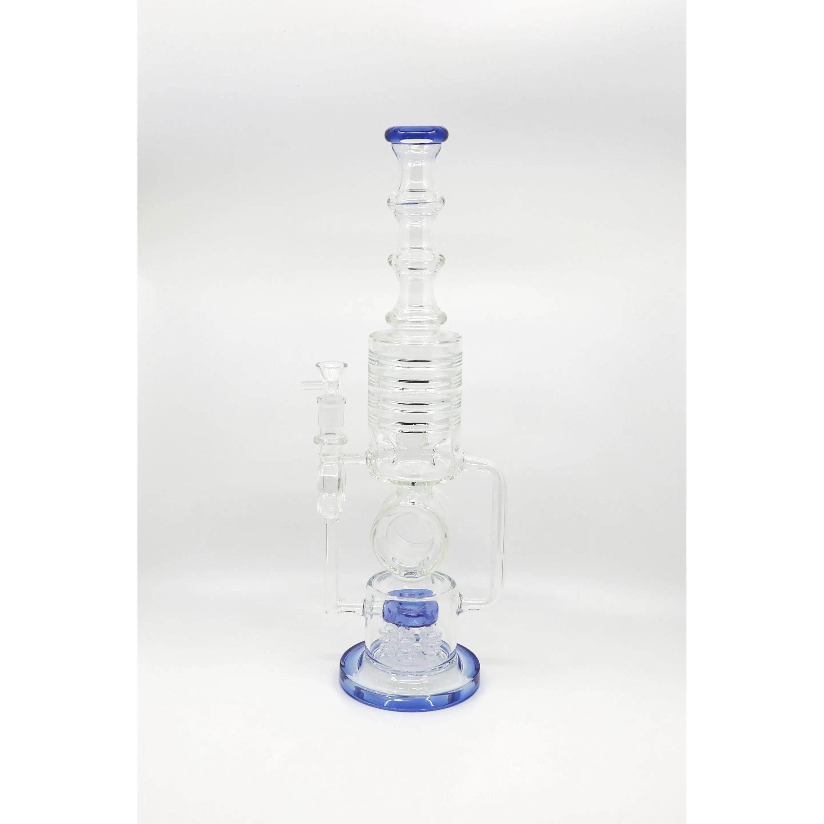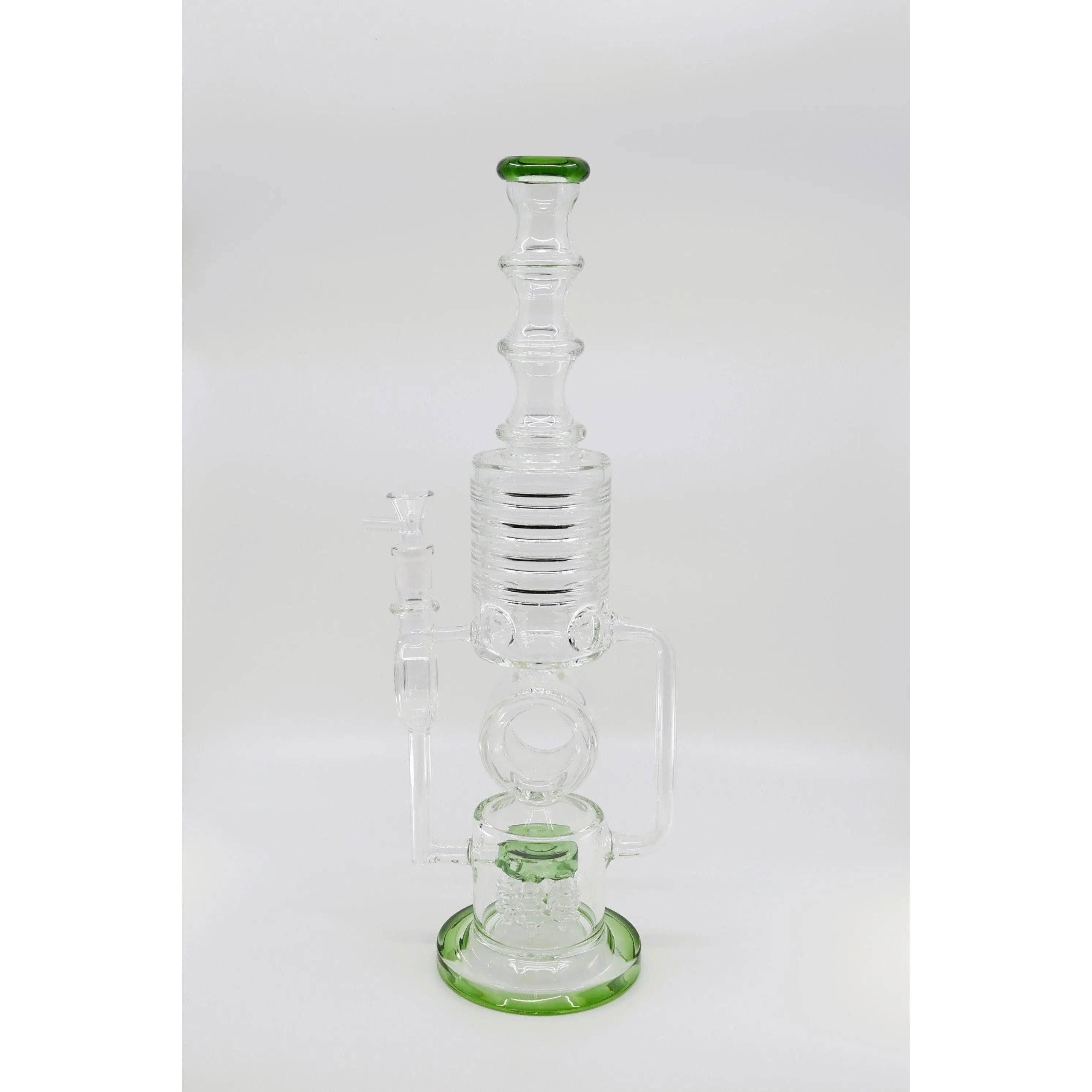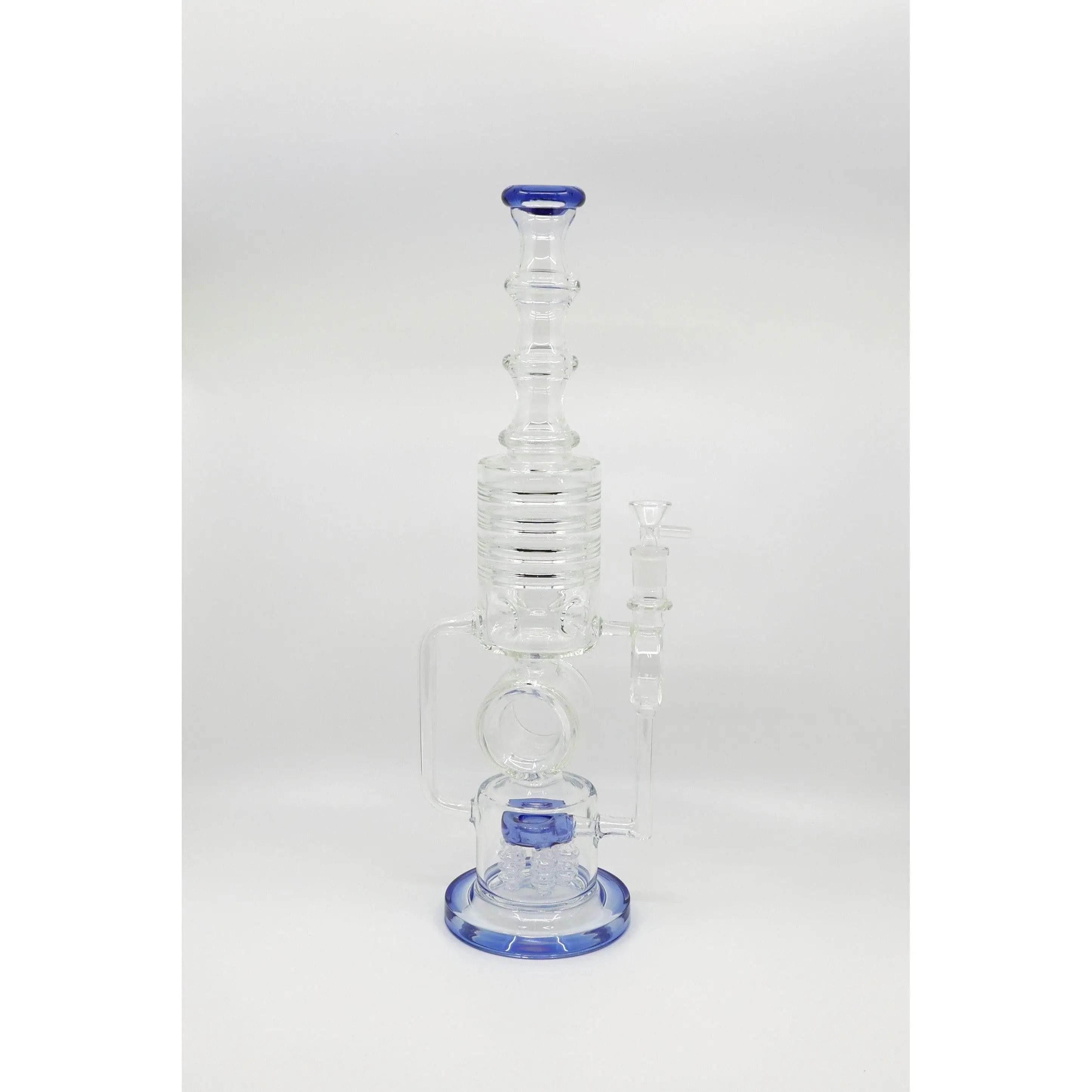Standing at an impressive 18 inches, this water bong boasts a commanding presence. Its clear borosilicate glass construction ensures durability while providing a clear view of the mesmerizing "Five-Button Shower Head" perc in action. This intricate perc is not only visually captivating but highly effective in delivering a superior smoking experience.
