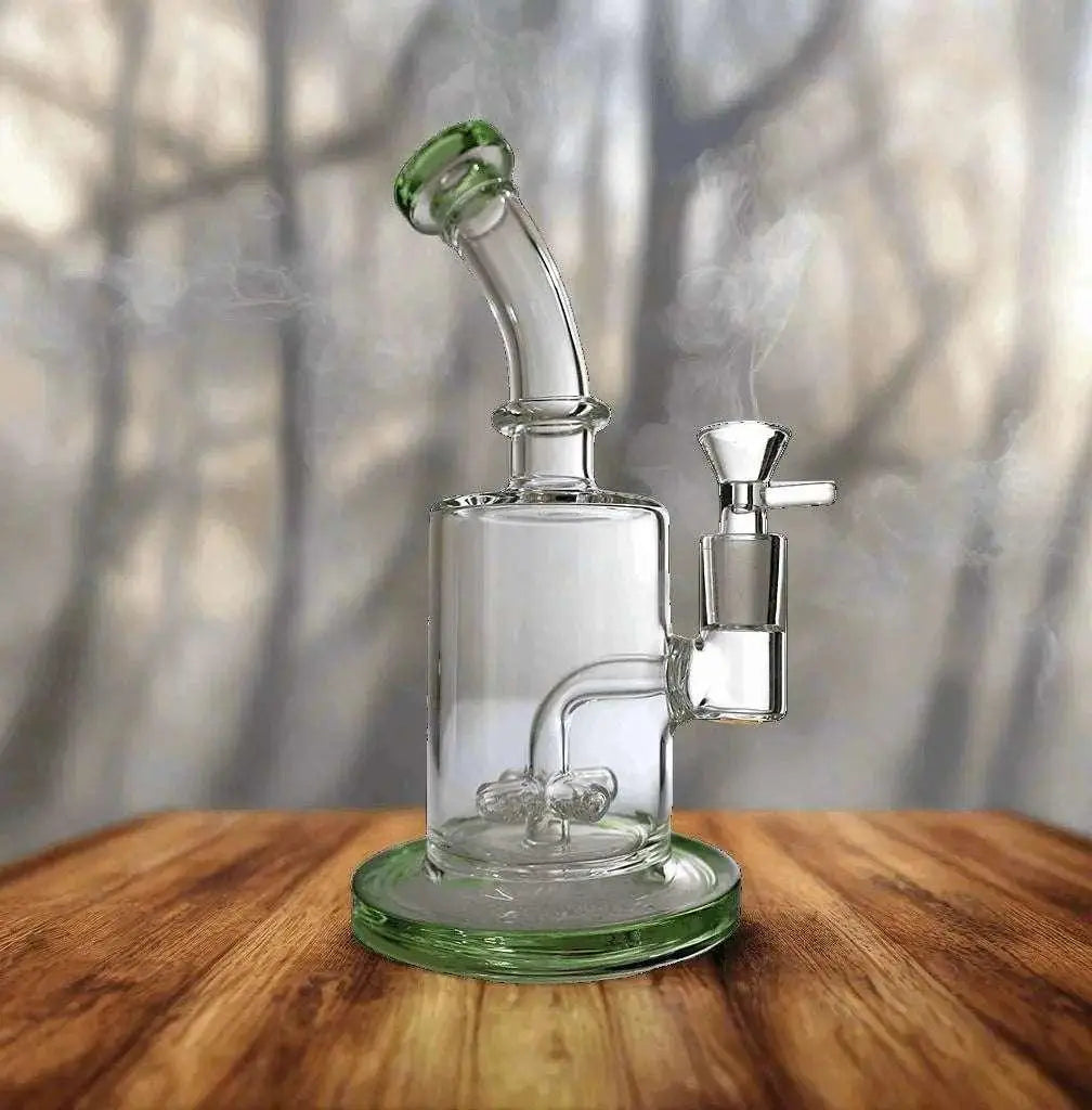 Showerhead Percolator Dab Rig 7" with Glass Bubbler on Wooden Table