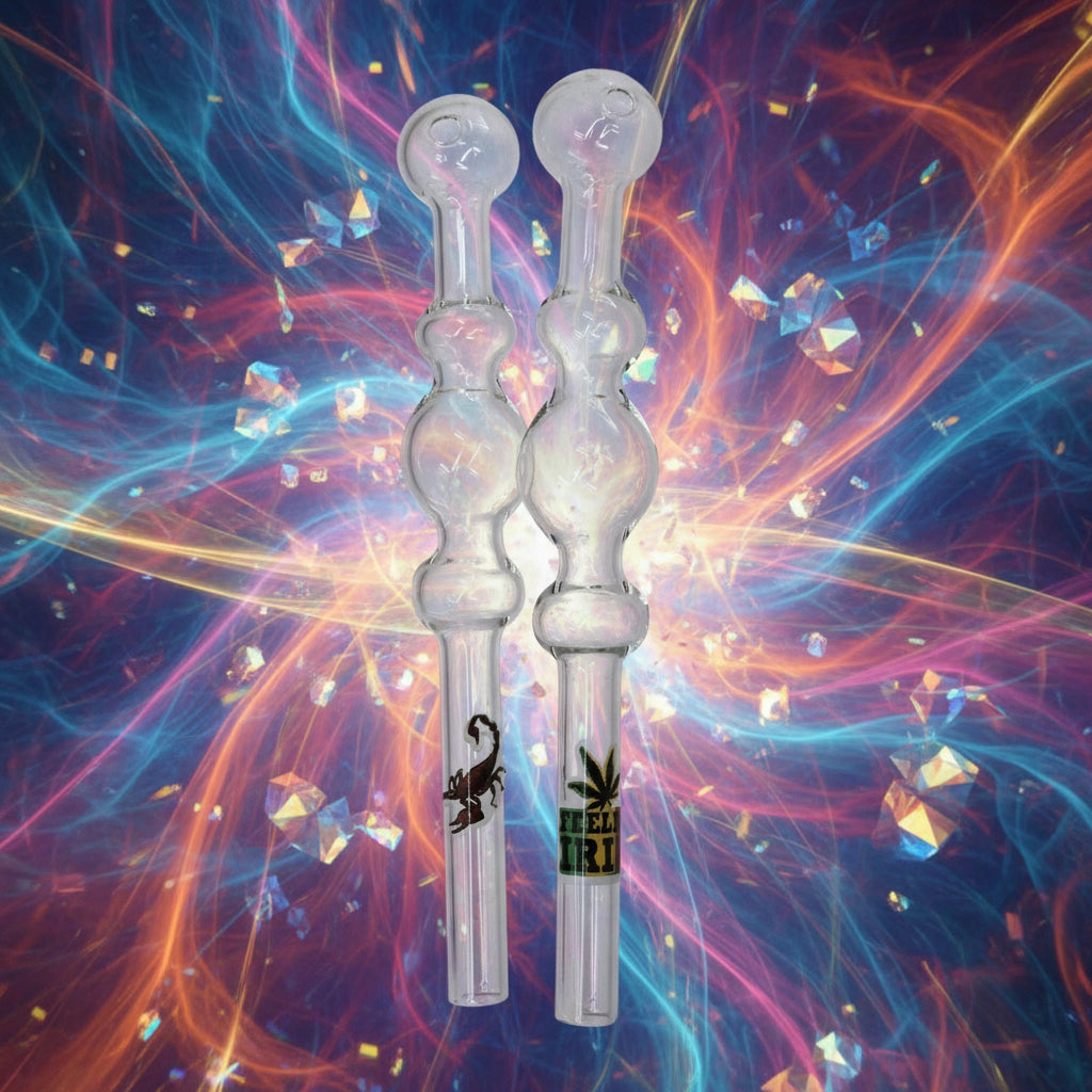 It is a glass pipe that measures about 9.5 inches in length and has four bubbles that form the chamber. It has a 10mm male joint that can fit most female adapters or water pipes. The pipe has a clear glass body that allows you to see the vapor production and the oil level.